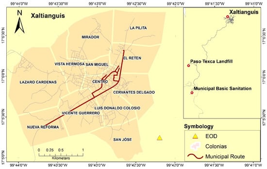 According to Del Carmen-Niño et al. [24], the municipality is made up of twelve colonias: Centro, Cervantes Delgado, El Retén, El Mirador, Lázaro Cárdenas, Luis Donaldo Colosio, Nueva Reforma, Vicente Guerrero, Vista Hermosa, La Pilita, San José and San Miguel (Figure 1). It is important to mention that the waste collection service depends on Acapulco, which is a popular beach resort with high and low tourist seasons. Due to the city’s economic dependence on this activity, there is a policy of prioritizing the provision of public services to visitors, although this situation may lead to a decrease in attention to certain areas of the municipality [25].