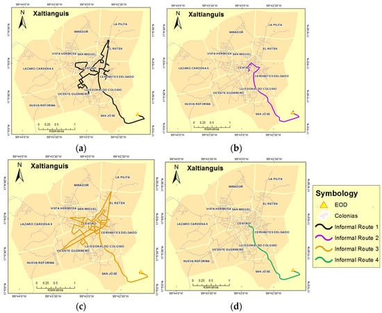 Figure 6 shows the informal collection of Xaltianguis, carried out in 2018 and 2019, where four vehicles operated (a–d). In 2021, only two vehicles (a,b) continue to work due to the increased frequency of the collection of the BSM.