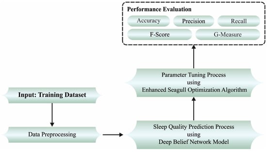 In this article, a novel WSHMSQP-ODL algorithm was formulated to assess sleep quality in a smart healthcare environment. The presented WSHMSQP-ODL technique initially enables the wearables to gather sleep-activity-related data. Next, data pre-processing is performed to transform the data into a uniform format. Moreover, the WSHMSQP-ODL method employs the ESGO with DBN model for sleep quality prediction. Figure 1 represents the overall working procedure of the WSHMSQP-ODL system. The figure shows that the training data are given as input to the proposed model, which initially undergo data pre-processing to make them suitable for prediction process. Next, the proposed model exploits the DBN model for sleep quality prediction and its hyperparameters can be optimally chosen by the ESGO algorithm.