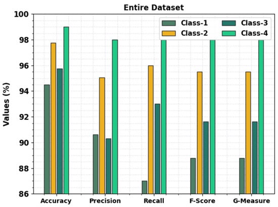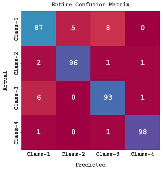 The confusion matrix presented by the WSHMSQP-ODL method on the entire dataset is shown in Figure 2. The WSHMSQP-ODL method sorts 87 samples into class 1, 96 samples into class 2, 93 samples into class 3, and 98 samples into class 4.