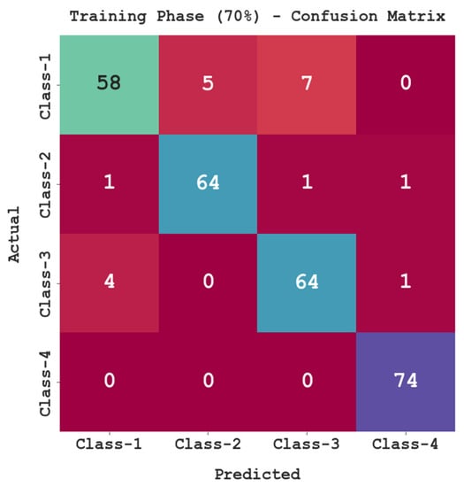 The confusion matrix rendered by the WSHMSQP-ODL method under 70% of the TR database is exhibited in Figure 4. The WSHMSQP-ODL approach sorts 58 samples into class 1, 64 samples into class 2, 64 samples into class 3, and 74 samples into class 4.