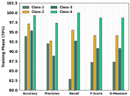Table 3 and Figure 5 exhibit brief sleep quality classification outcomes of the WSHMSQP-ODL method for 70% of the TR database. The simulation values manifested in the WSHMSQP-ODL methodology reaches enhanced classification results in all classes. It is notable that the WSHMSQP-ODL algorithm acquires an average of 96.43%, of 92.77%, of 92.78%, of 92.70%, and of 92.74%.