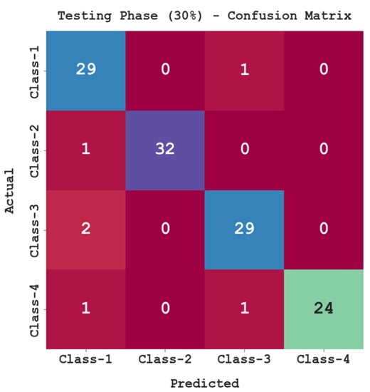 The confusion matrix provided by the WSHMSQP-ODL technique for 30% of the TS database is demonstrated in Figure 6. The WSHMSQP-ODL algorithm sorts 29 samples into class 1, 32 samples into class 2, 29 samples into class 3, and 24 samples into class 4.