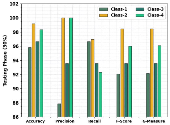 Table 4 and Figure 7 illustrate comprehensive sleep quality classification results of the WSHMSQP-ODL method for 30% of the TS database. The simulation values show that the WSHMSQP-ODL approach realizes enhanced classification outcomes in every class label. It is notable that the WSHMSQP-ODL algorithm gains an average of 97.50%, of 95.36%, of 94.87%, of 95.02%, and of 95.07%.