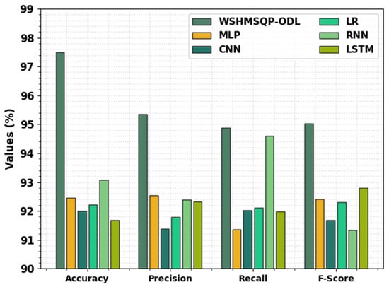 Finally, a comparison study of the WSHMSQP-ODL model on sleep quality classification is given in Table 5 and Figure 8 [,]. The simulation values demonstrate that the LSTM model shows a poor performance with the lowest of 91.67%. Simultaneously, the MLP, CNN, and LR methods report moderately closer classification results. The WSHMSQP-ODL model outperforms the other models with a maximum of 97.50%. These results verify the improved sleep quality classification results of the WSHMSQP-ODL model over other models.
