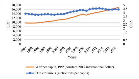 Next, after checking the correlation between CO2 and GDP, it is possible to affirm (at a 5% statistical significance) that the variables are relationship positive, which means the parameters maintain an isotonic relationship [39] and can be used on the proposed DEA model. Details about the correlation matrix are shown in the Appendix A (Table A1). In this test, a positive correlation shows that the variables have symmetrical behaviour, i.e., both increase and decrease simultaneously. This result suggests the existence of common factors in the increase or decrease of GDP and CO2. Moreover, the result of this test showing the correlation between variables should not be read as an impact between variables. Instead, it should be considered an indicator of their behaviour in pairs (symmetric, asymmetric, or neutral).