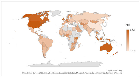 We present a map built with the PHI index for the year 2018 (Figure 3). The results show scale between 0 to 100%. However, only eight countries in the sample (Australia, Canada, Indonesia, Ireland, Netherlands, New Zealand, United Kingdom, and the United States of America) have a PHI index between 50% and 58.3%. They suggest that all countries (and their populations) have a great opportunity to grow and positively impact the eco-efficiency of the planet.