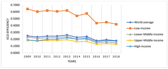 Next, average DEA results are shown in Figure 5. We found results that show countries’ average eco-efficiency regressed between 2009 and 2018. In addition, we also present the average results by income category, as classified by the World Bank [38]. Countries classified as low-income had the highest average eco-efficiency and were the ones that dropped the most in the indicator when analyzing the first and last years of the sample. If we go to the other extreme, the average of high-income countries also showed a drop, but the smallest drop among the different income categories of countries.