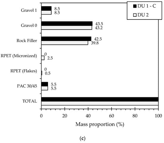 Declared unit hot mixed asphalt characterization and dosage: (a) resilient modulus and traction resistance; (b) bulk specific gravity and void volume; (c) dosage of hot mixed asphalt in the percentage of total mass, as declared by the author [20].