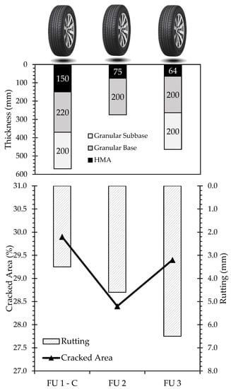 Functional unit characterization with thickness for each pavement variant and functional parameters such as cracked area (%) and track sinking prediction (mm) by the end of the analysis period.