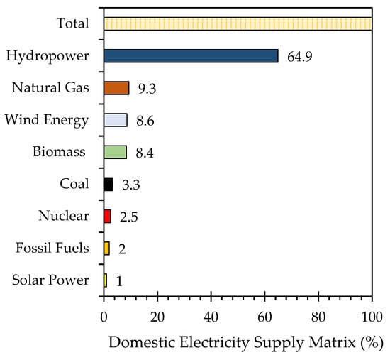 - Domestic electricity supply. The energy supply chain was adapted for the Brazilian Energy Balance, considering the domestic electricity supply by source in 2020, as presented in Figure 4. The upstream data are adapted from the inventory database;