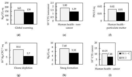 The weighting criteria establish a quantitative alternative to synthesize and compare the environmental performance of the studied products, which strengthens the decision-making process for the stakeholders and LCA practitioners into the better sustainable project alternatives. This allows for an easy comparison between the DUs and FUs for the present study by impact category or overall environmental score.