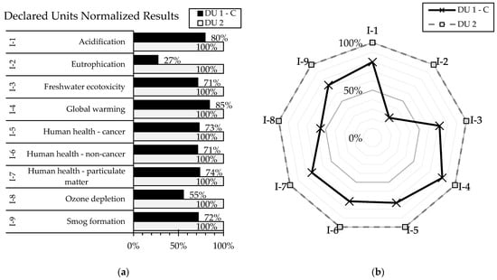 Relative results for environmental impacts comparing declared units: (a) Percentage comparison for each impact category. (b) Radar chart comparison for each declared unit.
