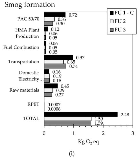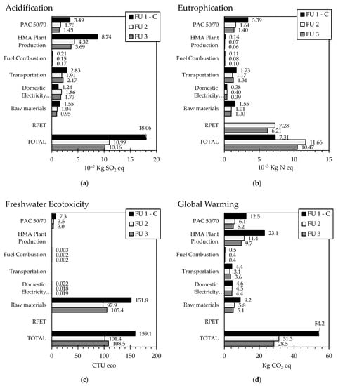 The pavement structures with HMA + RPET present an overall better environmental performance in all but one impact category. Both FU with HMA + RPET proposed (FU 2 and FU 3) resulted in similar performance on average, with savings in important impact categories such as global warming potential, with 58% and 53%, respectively, of equivalent carbon dioxide emissions in comparison with the FU 1 with the conventional HMA mix.