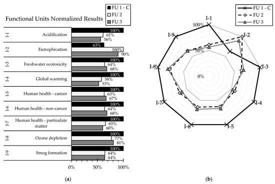 Relative results for environmental impacts comparing functional units: (a) Percentage comparison for each impact category. (b) Radar chart comparison for each functional unit.