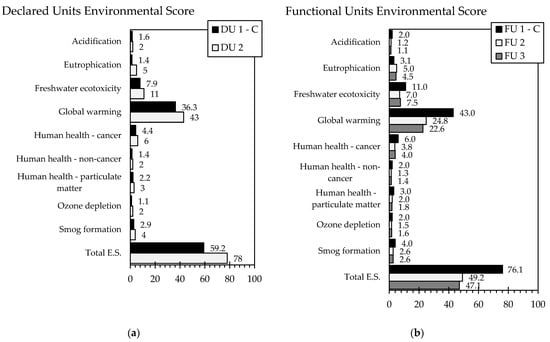 Environmental score: (a) declared units and (b) functional units; divided by category contribution and total score.