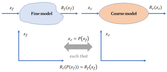 In Figure 2, and are design parameters of the coarse and fine models, respectively, and and denote corresponding model responses. As illustrated in Figure 2, the purpose of SM is to find an appropriate mapping p from the fine model parameter space to the coarse model parameter space , as given by: