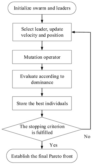 To apply the PSO strategy to solve multi-objective optimization problems, many approaches have been embedded into PSO [25,26,27,28,29]. In the PSO, multi-objective optimization algorithms use the concept of Pareto front, and the best non-dominated positions (leaders) are used to guide particles [30]. To maintain the Pareto optimal solutions identified, an additional set, called the external register, is used to store the non-dominated solutions discovered during the search. A new solution is included in the register if it is not dominated by all of its members. If some members are dominated by the new solution, it is usually removed from the registry. Most of the existing MOPSO algorithms apply some sort of mutation operator [30]. Figure 3 shows the flow chart of a MOPSO algorithm.