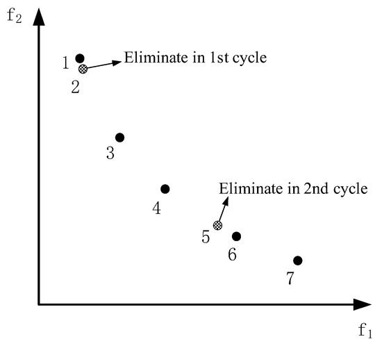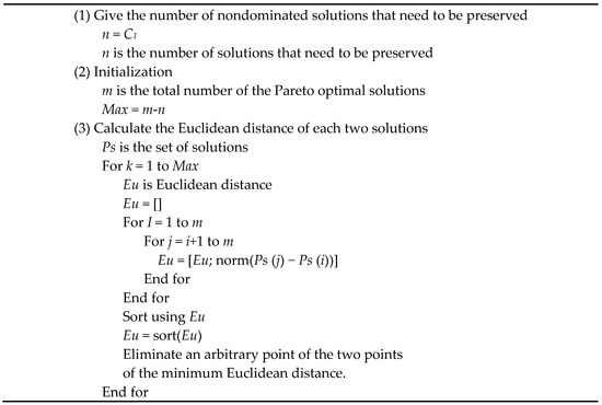 It is well known that the calculation of the Euclidean distance in design space between any two particles reflects their degrees of closeness. Figure 4 shows the procedure of selecting PF. As shown in Figure 4, the minimum Euclidean distance is between particles 1 and 2 of the obtained PF. First, the procedure should randomly eliminate one of the particles, and assume the removed particle is the second in the pair. Then, the Euclidean distance of any two particles in the rest should be calculated and sorted. In the rest of the particles, the minimum Euclidean distance is between particles 5 and 6. Similarly, one of the two particles should be randomly removed, and assume the removed particle is fifth one, and so on. The final particles are those that need to be preserved. Figure 5 shows the pseudocode of the CDE. After completion of the CDE procedure, the information of the selected optimal solutions of LFM will be transferred to HFM through the PT strategy.