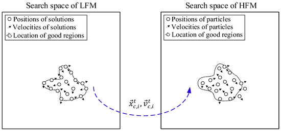 After optimization of the LFM, the particles usually search in the local regions. It is a critical issue to determine the searching direction. The search direction based on the HFM should guarantee the convergence of the entire optimization procedure. The parameters that need to be transferred are the velocities and positions of the LFM. As shown in Figure 6, the velocities and positions of the LFM’s solutions selected by the CDE are used as the velocities and positions of the HFM’s initial population.