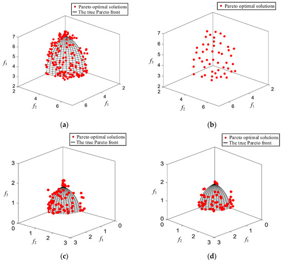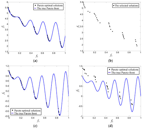 The optimization results of UF8. (a) The result of optimizing LFM. (b) Solutions selected using CDE. (c) The result of optimizing HFM using VFMEM after 10 iterations. (d) The result of optimizing HFM directly after 100 iterations.
