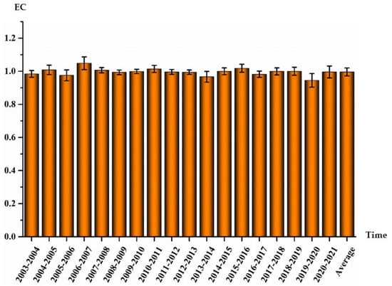The summary statistics of efficiency change (EC) value over 2003–2021 in China (bars denote standard deviation).