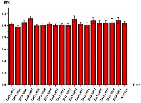 The summary statistics of best-practice gap change (BPC) value over 2003–2021 in China (bars denote standard deviation).