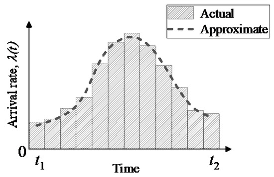 In the passenger flow control strategy, the main commuter stations in peak hours are managed. Due to the relatively fixed starting and ending points of companies, schools and homes, it can be considered that the OD ratio between line stations remains unchanged during this period. It can be estimated by the Automatic Fare Collection (AFC) data, and combined with the curve of the arrival rate changing with time shown in Figure 2, the number of OD demands between lines and stations in a certain period of time can be further calculated [33]. The expressions are given in Equations (1) and (2):