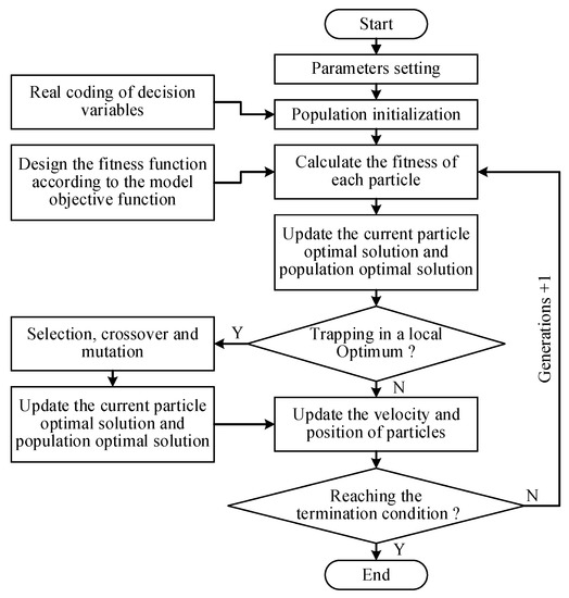 Because of the NP (nondeterministic polynomial) characteristics of the problem and model studied in this paper, a hybrid optimization algorithm based on particle swarm optimization and a genetic algorithm (PSO-GA) is designed, which combines the simple operation and ease of implementation of PSO with the strong global search capabilities and fast convergence of the GA to better solve the model. The solution process is shown in Figure 3.