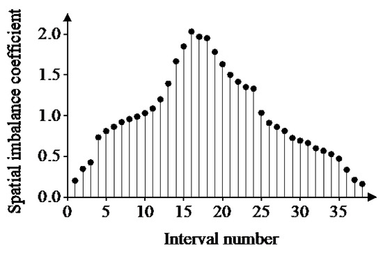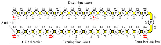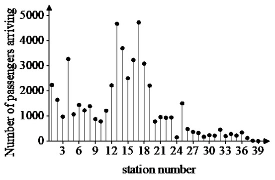Based on the relevant data of Qingdao Metro Line 1 in Shandong Province, China, a case study is conducted to verify the feasibility and effectiveness of the proposed method and model. Line 1 is a north–south trunk line connecting downtown and distant residential areas with 39 stations, and stations 1, 6, 20, 28, and 39 have turnback conditions. The line information is shown in Figure 4. The study period is 18:00–19:00 on a weekday evening peak (the time imbalance coefficient is greater than 1.5). During this period, the up direction is the direction of heavy passenger flow. The spatial imbalance coefficient of passenger flow is shown in Figure 5, and the arriving passenger flow of each station is shown in Figure 6.