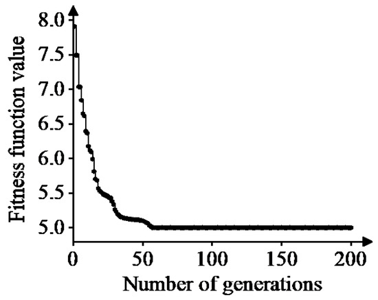 According to the results of the flow control period division, the relevant parameters are brought into the model for solving. Figure 9 shows the solution process of the algorithm. The target value of the optimal individual exhibits a downward trend before the 55th iteration and stabilizes and reaches the optimal solution after the 55th iteration.