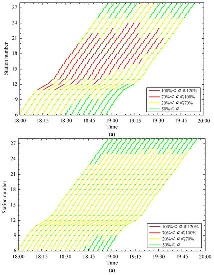 In Figure 10a, it can be seen that the crowded areas are concentrated from Station 11 to Station 24 during the evening peak period, especially some sections between Station 16 and Station 19, where colors are almost all dark red, indicating that the load rate of the train is very high, the train is extremely congested and COVID-19 in the compartment spreads easily. The optimization results in Figure 10b show that under the condition that the passenger waiting time and the total operating cost of the whole line have not increased substantially, the full load rate of each train running during this period obviously decreases, 105 red sections and 22 dark red sections have disappeared, the maximum load rate is reduced by 35.18%, and the load rate of each section meets the requirements of COVID-19 prevention and control of no more than 70%. There are two reasons for the decrease in the maximum load rate of the optimized train. First, the increase in the number of running trains and the capacity provided by the operation of the full line optimize the allocation of resources on the supply side. Second, the implementation of flow control measures slows the concentration of passenger flow into the station to a certain extent, and the amount of passenger flow into the station in the whole period is more balanced, avoiding excessive demand in a certain period of time.