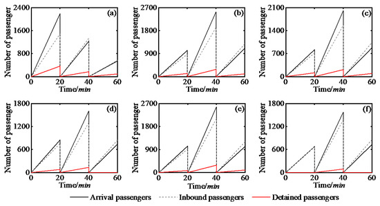 Number of arriving passengers, inbound passengers and detained passengers at control stations: (a) station 4; (b) station 13; (c) station 14; (d) station 16; (e) station 17; (f) station 18.