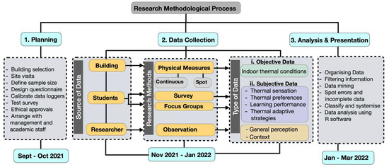 - The data collection stage was developed to collect on-site records from three main sources: (i) the building (i.e., physical measurements); (ii) the students (i.e., thermal perception, perceived learning performance, physiological and psychological data); (iii) the research team or data collector, since they play a vital role during fieldwork by systematically inspecting on-site parameters related to the design of a surveyed building or students’ behaviour.