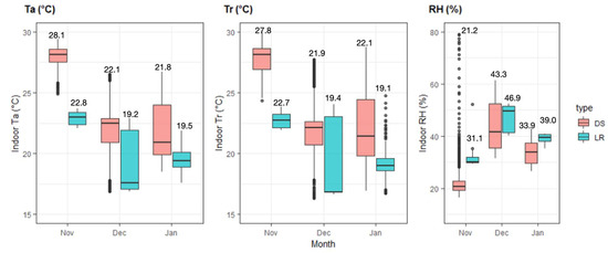 The monitored thermal conditions (i.e., Ta, Tr, RH) in the surveyed lecturer rooms between November 2021 and January 2022. Data were grouped on the basis of the university hall type; DS refers to the architecture design studio, LR refers to lecture rooms, whiskers indicate the minimum and maximum readings, black dots indicate the outliers, a bold black line indicate the median score, and the value beside each box-plot represents the mean score.