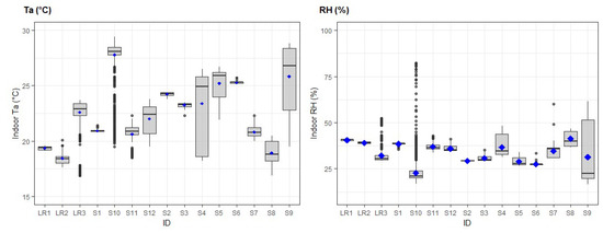 Box plots showing the difference values between the monitored Ta and RH among all surveyed spaces (each space has a unique ID; see Table 3). Whiskers indicate the minimum and maximum scores, black dots indicate outliers, blue square indicates mean score for each university hall; Nsurveyed halls = 15.