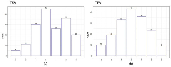 (a) The overall distribution of the thermal sensation votes (TSV) as reported by students and (b) the overall thermal preference votes (TPV) in the surveyed lecturer halls. The survey data are ordinal and are hence presented within [−3, +3]; the number above each column represents the count of votes; nstudents = 173, Nlecturer halls = 15.