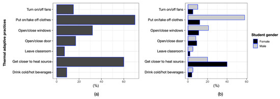 To understand how students behave to increase their thermal comfort levels in their university halls, we investigated the thermal adaptive practices adopted by students during lecture time. Figure 9a shows the thermal practices that were classified into three groups: (i) environmental modifications to space (e.g., opening/closing windows, turning on/off fans or heater usage), (ii) behavioural adaptations (e.g., drinking cold/hot drinks, putting on/take off a piece of garment, changing position within the classroom), and (iii) withdrawal from space (e.g., leave lecture room). Results indicated that behavioural adaption was the most used practice among the surveyed students. For example, 70% of students heavily depended on removing or adding a piece of clothes to adjust their body temperature in their university halls.