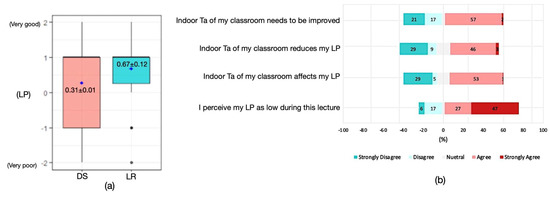 (a) Comparison of the observed TSV in design studios (DS) and lecture rooms (LR), and (b) the predictive mean vote (PMV) as predicted by Fanger’s model ISO 7730 (2005). PMV data were calculated using spot measurements. The coloured dashed lines represent the mean score of variables, and the dotted grey line represents the recommended range by ISO 7730 [−0.5, +0.5]; nstudents = 173.