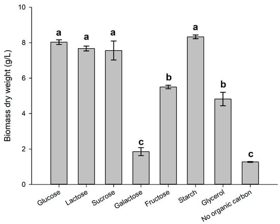 The highest biomass after 7 d of cultivation was obtained with the medium supplemented with glucose, lactose, sucrose, and starch, reaching a biomass DW of 8–8.2 g/L. Glucose is currently the monosaccharide of choice for P. irregulare cultivation. Nevertheless, our results suggest that lactose, sucrose, and starch can also be effectively used as substitutions for glucose without a significant difference in terms of biomass growth. In fact, lactose was used in another study with P. irregulare [], which showed good growth performance with a lactose-based medium. Moreover, sucrose was successfully used for the cultivation of another Pythium specie (P. ultimum), which is in line with our experiment [].