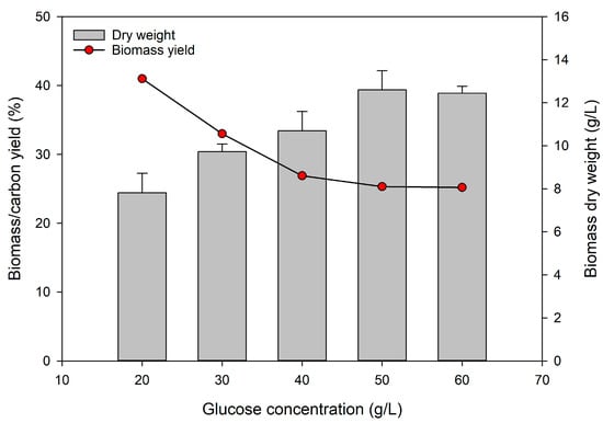 Once the organic carbon screening was performed, the biomass conversion yield of glucose was assessed using increasing concentrations of glucose in the standard medium. Figure 2 shows the results of the growth performances at different concentrations of glucose with the relative efficiency of use.