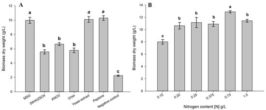 Screening test of different sources (A) and concentrations (B) of nitrogen on P. irregulare growth. The organic carbon source used in the experiment was glucose (30 g L−1). Different nitrogen concentrations in (B) were achieved using yeast extract. Data are expressed as mean ± SD. Different letters mean a significant difference (p < 0.05).