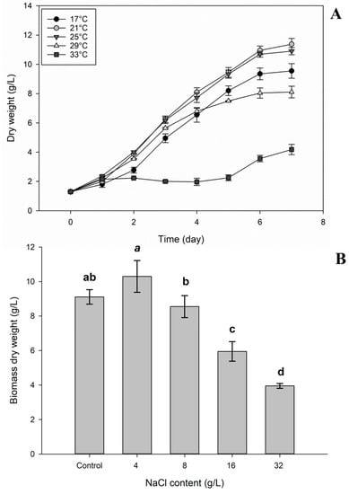 Effects of temperature (A) and NaCl supplementation (B) on growth performance of Pythium irregulare (control without NaCl supplementation). Data are expressed as mean (n = 3) ± SD. Different letters mean a significant difference (p < 0.05).