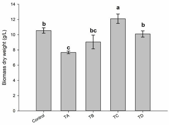 The highest carbon/biomass conversion efficiency (41%) was achieved with 20 g L−1 of glucose. However, the dried biomass obtained was the lowest with respect to the other formulations. The highest biomass DW was obtained with 50 g L−1 of glucose, and further carbon additions did not show any significant improvement in growth performance. The conversion efficiency is an important factor to study in order to achieve the highest biomass obtainable at the lowest supplementation of organic carbon. This yield is mostly important for further scaling up in order to reduce production costs and thus avoid wasting resources []. In our case, the best compromise would be to use 30 g L−1 of glucose, thus obtaining a DW of about 10 g L−1, rather than using 50 g L−1 of glucose to obtain just an increased DW of 2 g L−1.