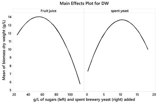 The interaction between the factors did not show any significant impacts on biomass production (Table 2). However, since the individual effects of SBY and EFJ supplementation showed significant impacts on biomass productivity, one factor plot for these two factors was generated to better understand the results from the RSM analysis (Figure 6).