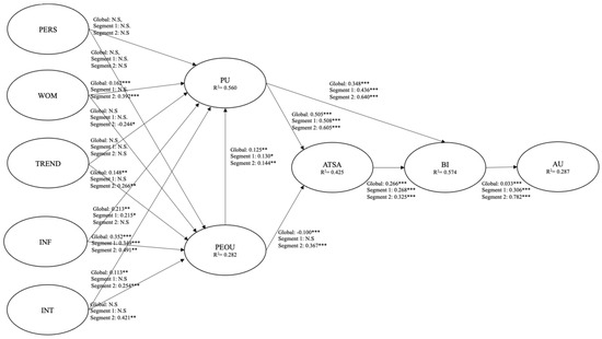 Consumer-revealed segmentation can show potential segments for a product and provide an understanding of the segment’s motives, lifestyles or needs [89]. Identifying segments disclosed by the consumer from a set of variables can show different levels of response from each segment to a product [90]. Individual differences in psychographic characteristics can be found in groups with the same demographic characteristics, leading to different purchasing processes [91]. To segment shoppable ads consumers, a posteriori segmentation is proposed based on the latent constructs: the perception of trend, privacy concern and purchase intention. For this segmentation, we first tested a model using a structural equation modeling approach, specifically PLS-SEM, to evaluate the validity, reliability and proposed hypotheses. This technique evaluates causal relationships between latent variables [92]. The evaluation of the measurement and structural models was according to the recommendations of the previous literature [93,94,95]. Then, in the second step, we identified the consumer segments of shoppable ads using the finite segmentation technique (FIMIX-PLS). This technique allows us to calculate the parameters and segments of the observations simultaneously. In step 3, we compared the differences in the model between the segments using PLS-multi-group analysis (MGA). We analyze the different behaviors of each segment in the proposed model with this technique. Finally, in step 4, the resulting segments were characterized by analysis of variance (ANOVA) for the variables: age, concern for privacy, trust and online purchases. Data were analyzed using SmartPLS 4 statistical software [96].