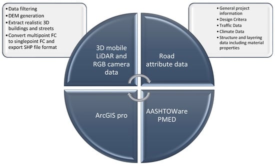 In recent years, advances in information and communication technologies (ICTs) have represented a substantial threat to the previously predictable landscape of urban infrastructure services. Smart pavements offer many benefits to road users and the agencies constructing and maintaining these roads. A diagram exhibiting the SUIMS intended for this paper’s purpose is elaborated in Figure 2 to fulfill this objective. The 3D mobile LiDAR and RGB camera, and the road attribute data are two data groups working together to satisfy the research objectives. At the same time, AASHTOWare PMED and ArcGIS Pro are integrated to analyze this paper. The details of the designed methodology are presented in the following sections.