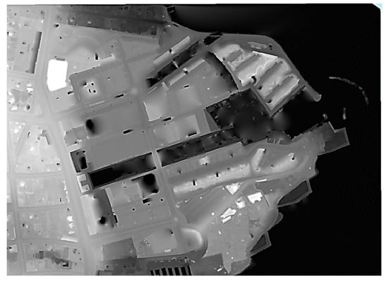 After importing the LAS dataset into the ArcGIS Pro software, all the noises were removed by the “LAS point filter” in the LAS dataset layer panel. Then, an accurate digital elevation model (DEM) was needed; this is the base of all the analyses requiring height and 3D model construction. For this objective, the ground points were obtained by filtering the data and extracting the ground points. By applying the “LAS dataset to Raster” option and selecting the interpolation type as “triangulation”, which is more accurate and publicly known, DEM was created, as shown in Figure 6.