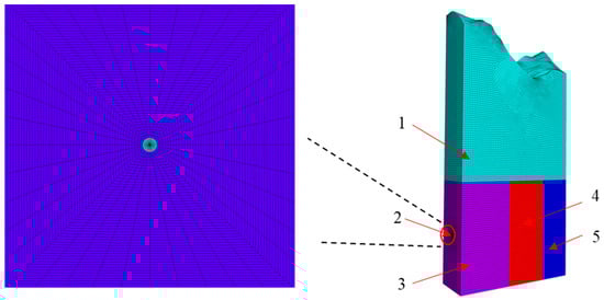 Calculation model diagram. 1. Low-resistivity overburden; 2. Water tunnel; 3. Slightly altered rock zone; 4. Moderately altered rock zone; 5. Strongly altered rock zone.