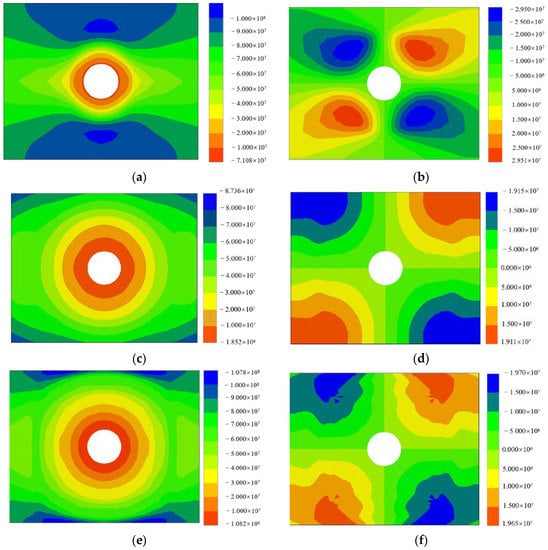 Main stress diagram of the excavation after the tunnel support. (a) Middle main stress diagram of the slightly altered surrounding rock section. (b) Shear stress cloud diagram of the slightly altered surrounding rock section. (c) Middle main stress diagram of the moderately altered surrounding rock section. (d) Shear stress cloud diagram of the moderately altered surrounding rock section. (e) Middle main stress diagram of the strongly altered surrounding rock section. (f) Shear stress cloud diagram of the strongly altered surrounding rock section.